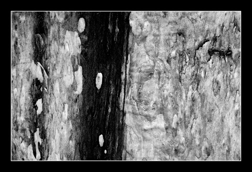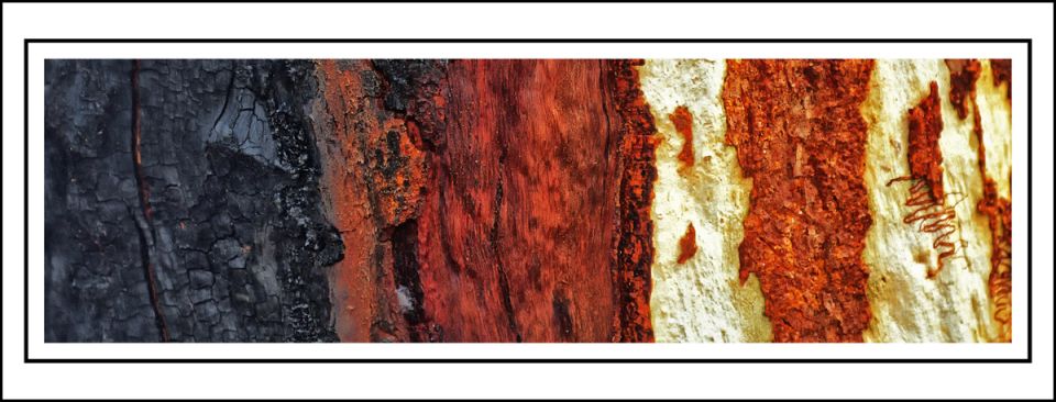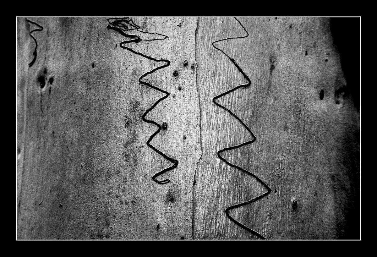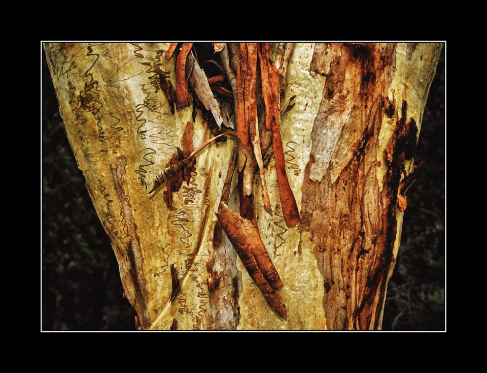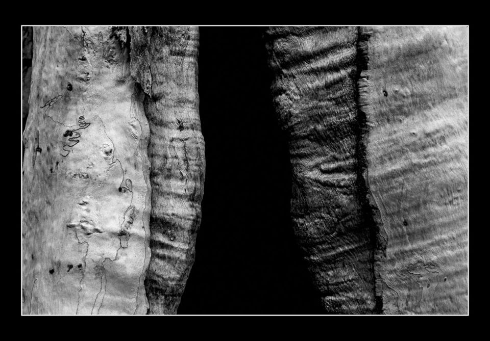 Trunks of eucalyptus trees on Fraser Island in Australia are graphically arranged.